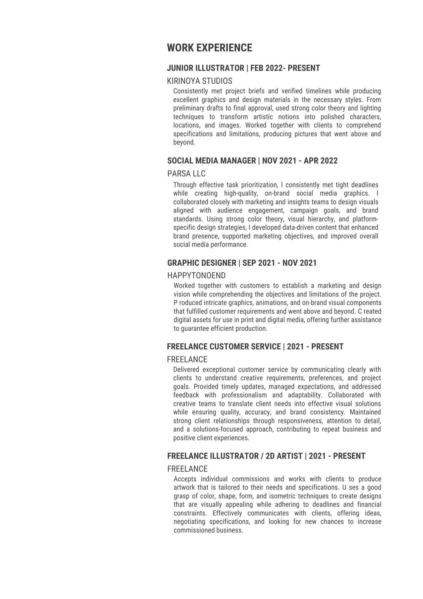 I successfully represented my school in the Shell National Student Art Competition's Digital Arts category and displayed my artwork in a number of local exhibitions during my academic career. These early encounters reinforced my resolve to keep developing as an artist.With practical experience in both domestic and foreign studio settings, including creative production work in Japan and professional engagements in the Philippines, I'm currently open to opportunities as an illustrator/2D artist.