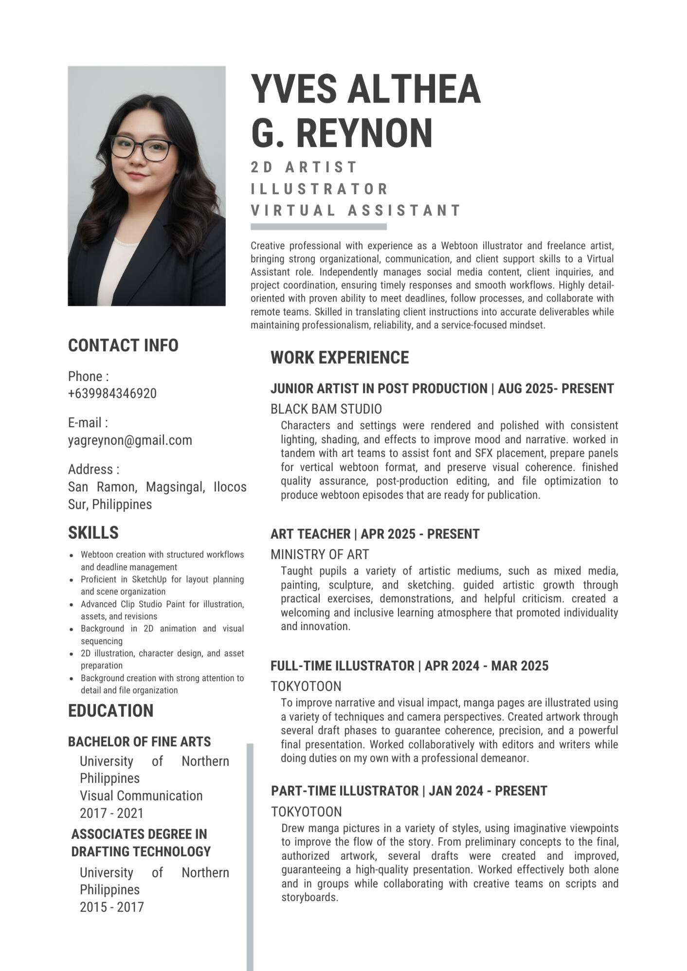 I graduated from the University of Northern Philippines' College of Fine Arts and Design on July 17, 2021, with a Bachelor of Fine Arts with a Major in Visual Communication. My interest has always been telling inspiring and relatable visual stories.